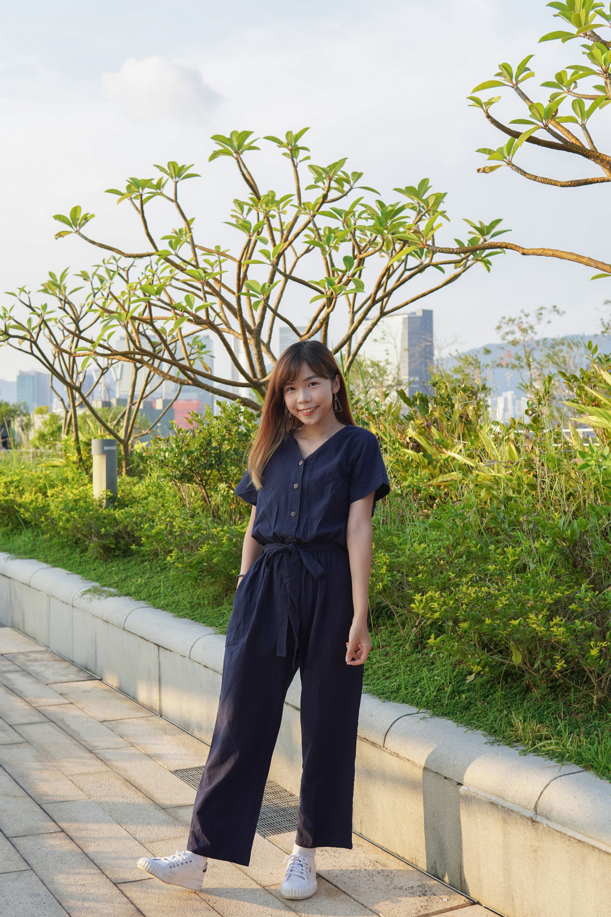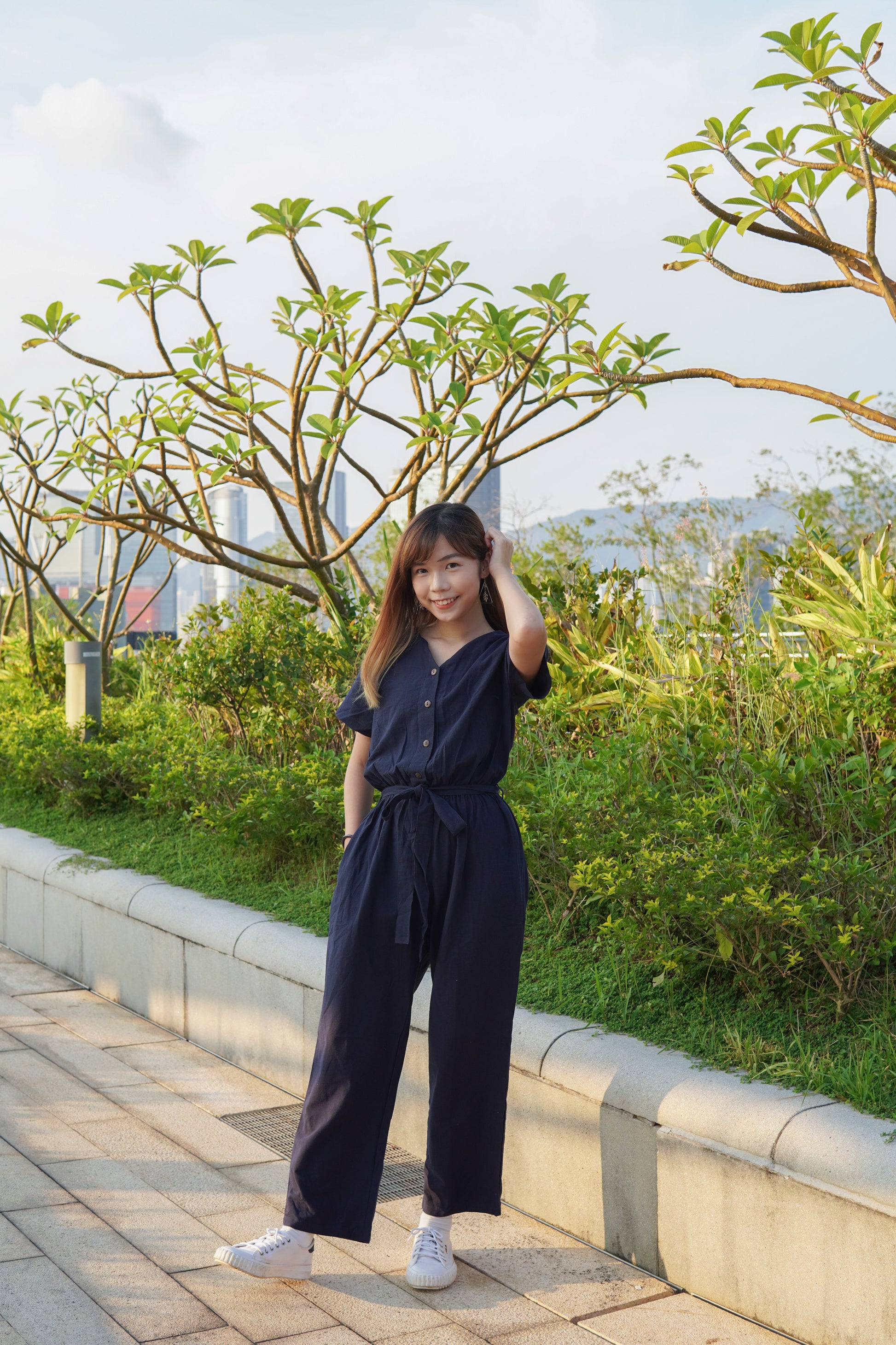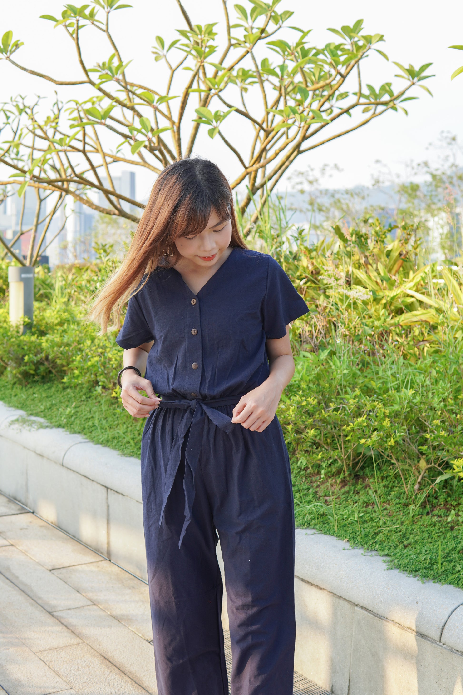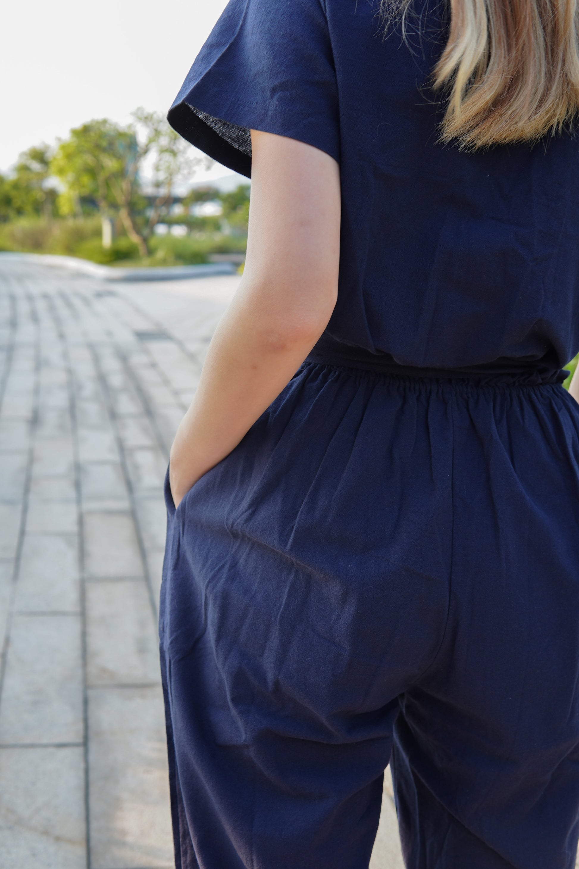 V領鈕扣橡筋腰口袋連身長褲 | 深藍 (現貨)