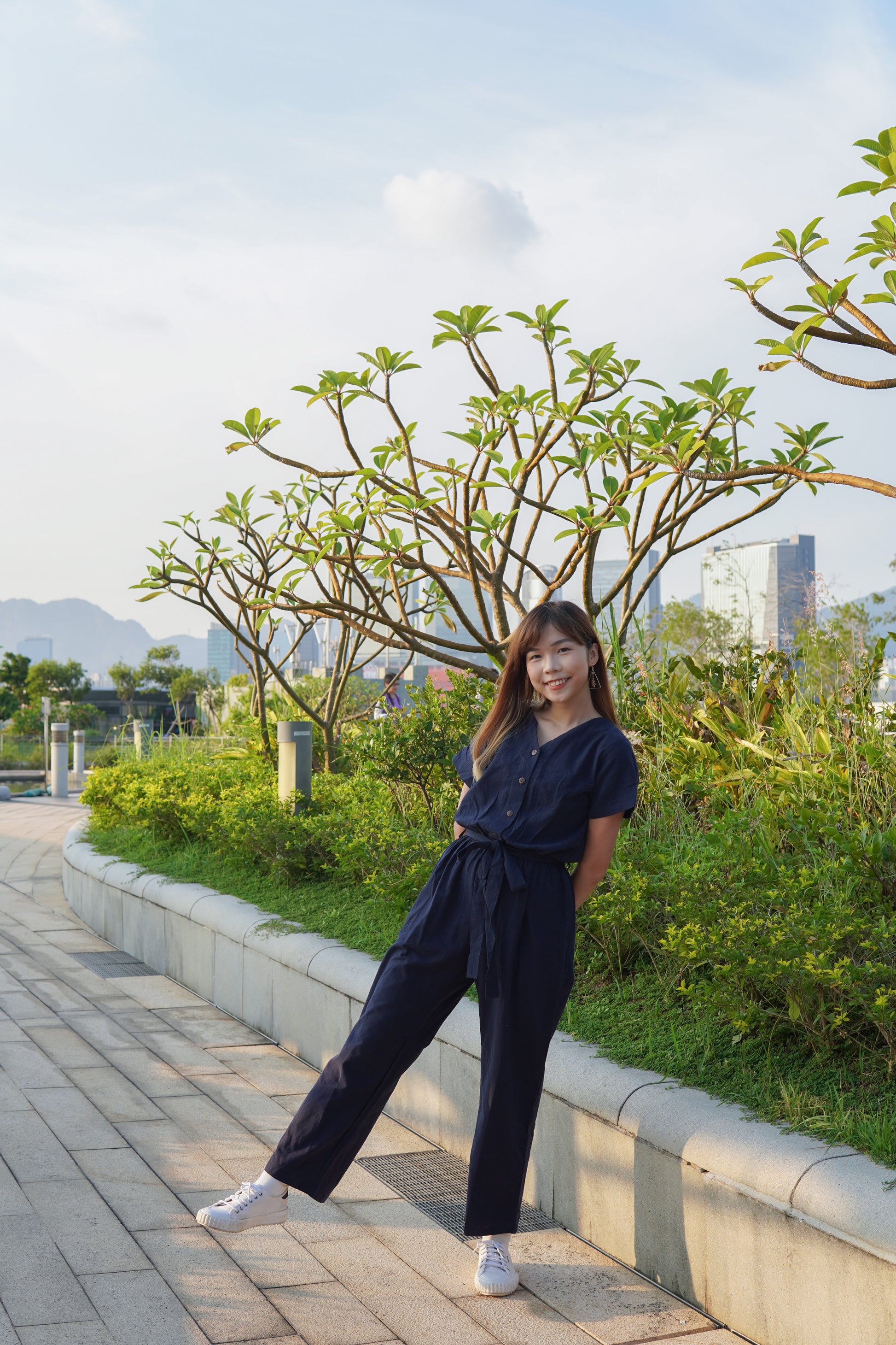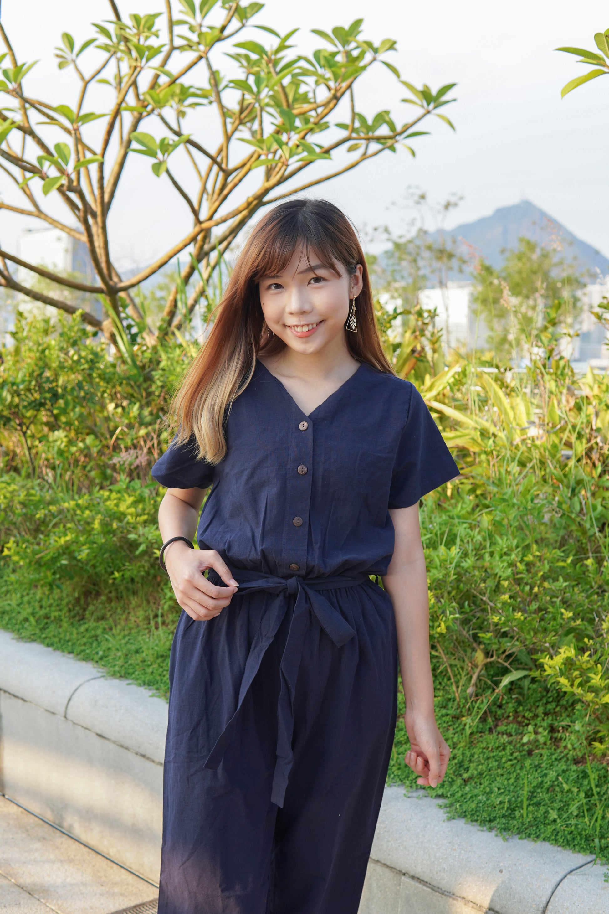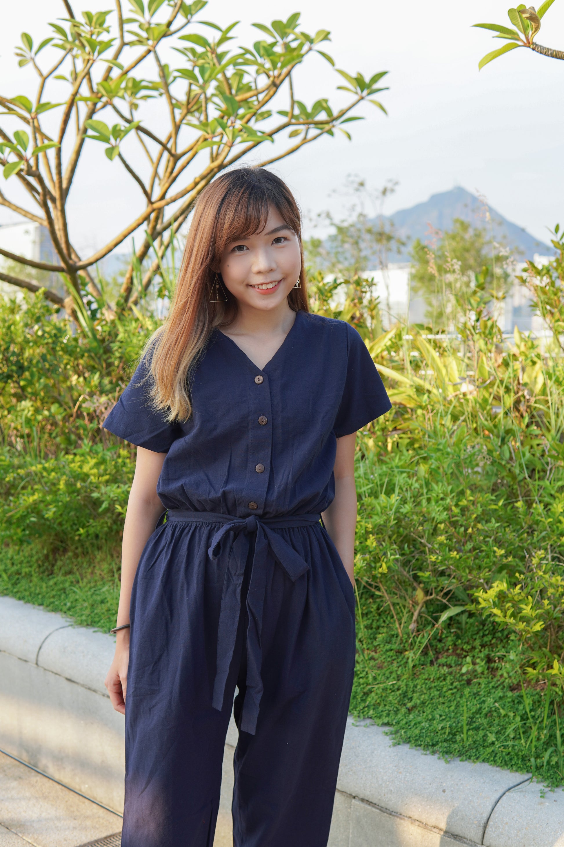 V領鈕扣橡筋腰口袋連身長褲 | 深藍 (現貨)