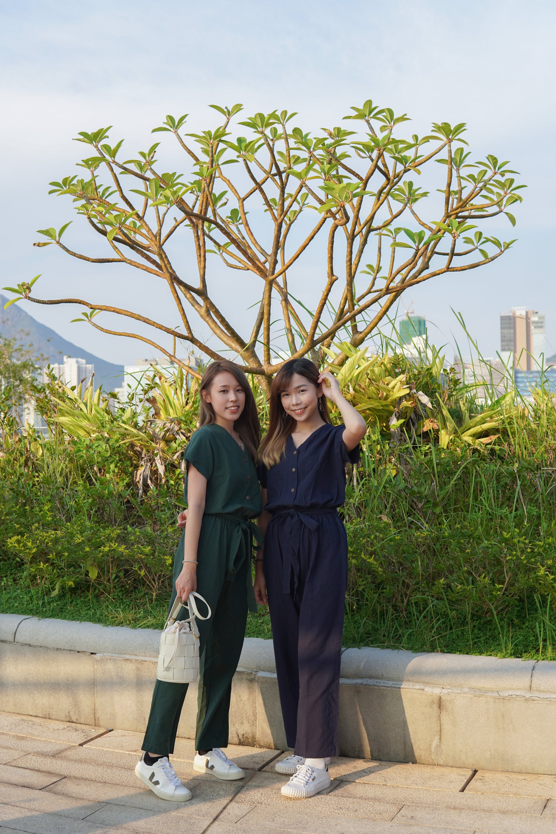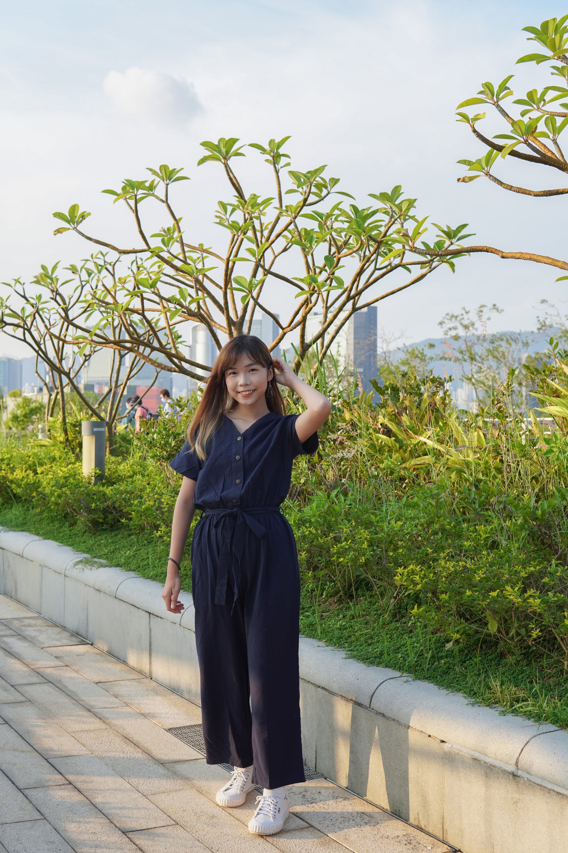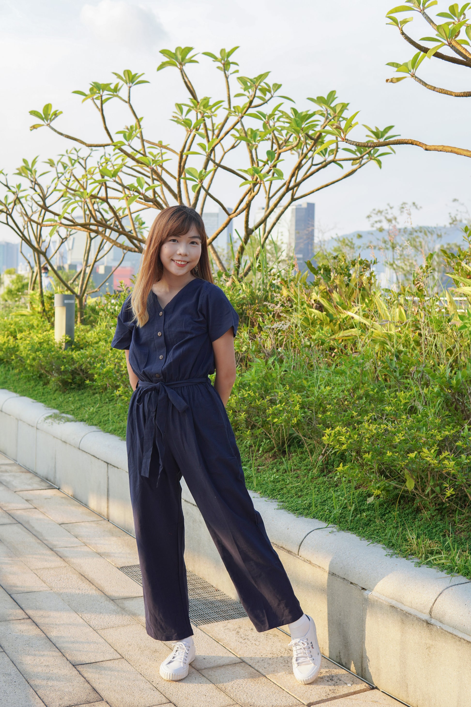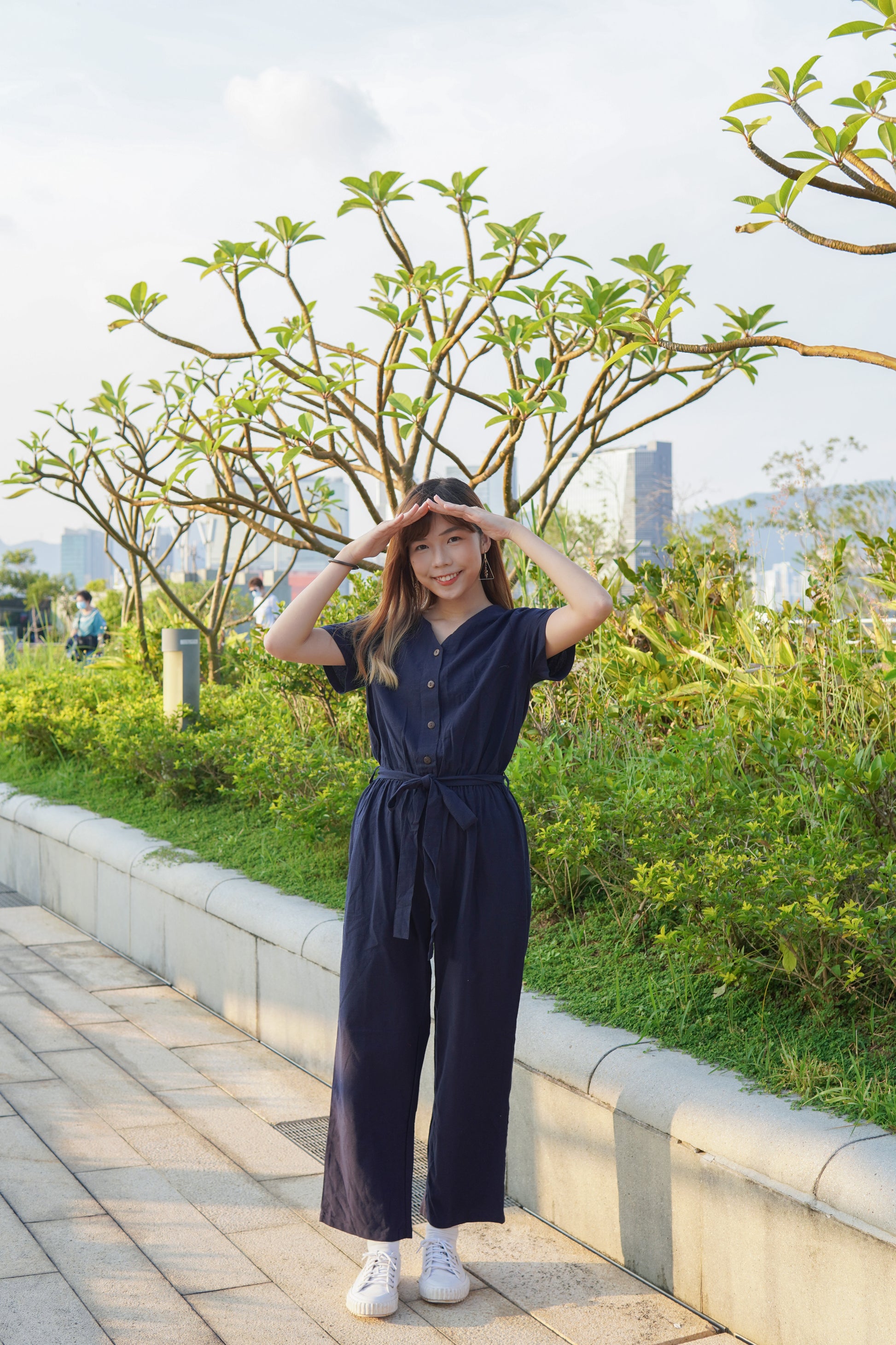 V領鈕扣橡筋腰口袋連身長褲 | 深藍 (現貨)